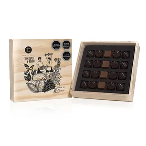 Caja de madera con bombones de ganache de pisco sour, trufa de pisco añejo con frambuesa y praliné almendras. 200 gr.